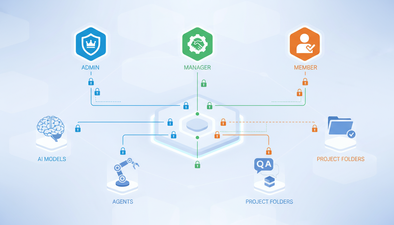 - กำหนดสิทธิ์ตามบทบาท เช่น Admin, Manager, Member รวมถึงการจำกัดการเข้าถึงโมเดล, Agent, Prompt หรือโปรเจ็กต์บางชุด