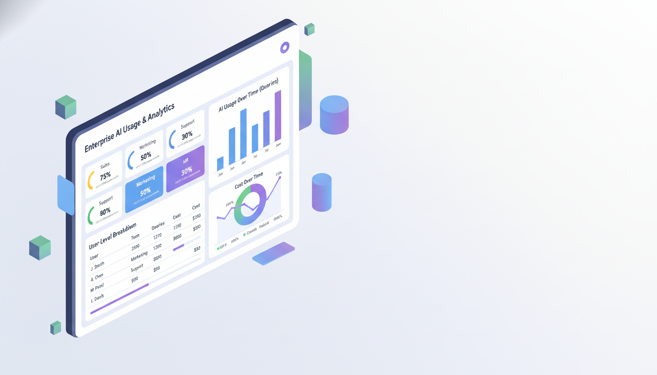 ออกแบบมาสำหรับองค์กรที่ต้องการมาตรฐานด้านความปลอดภัยและการกำกับดูแล รองรับ SSO, RBAC, การตั้งขีดจำกัดการใช้งาน และมุมมองภาพรวมผ่านแดชบอร์ดเดียว ทำให้รู้ว่าใครใช้ AI ทำอะไร ใช้เท่าไร และมั่นใจได้ว่าทั้งหมดอยู่ภายใต้นโยบายองค์กร